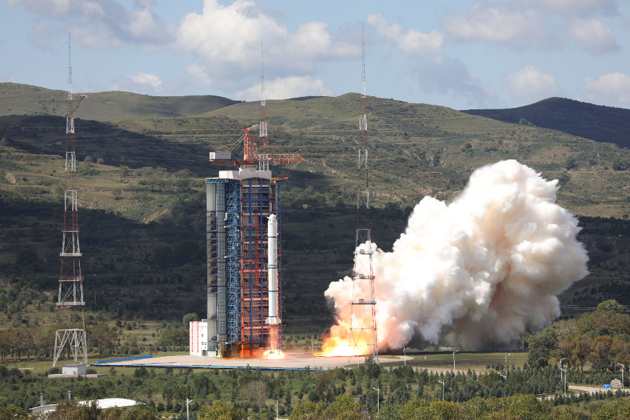 File photo shows a Long March-2C rocket carrying the HY-1C satellite takes off from the Taiyuan Satellite Launch Center in north China's Shanxi Province, Sept. 7, 2018. The satellite HY-1C will help improve understanding of maritime waters and climate change. (Xinhua/Zheng Taotao)