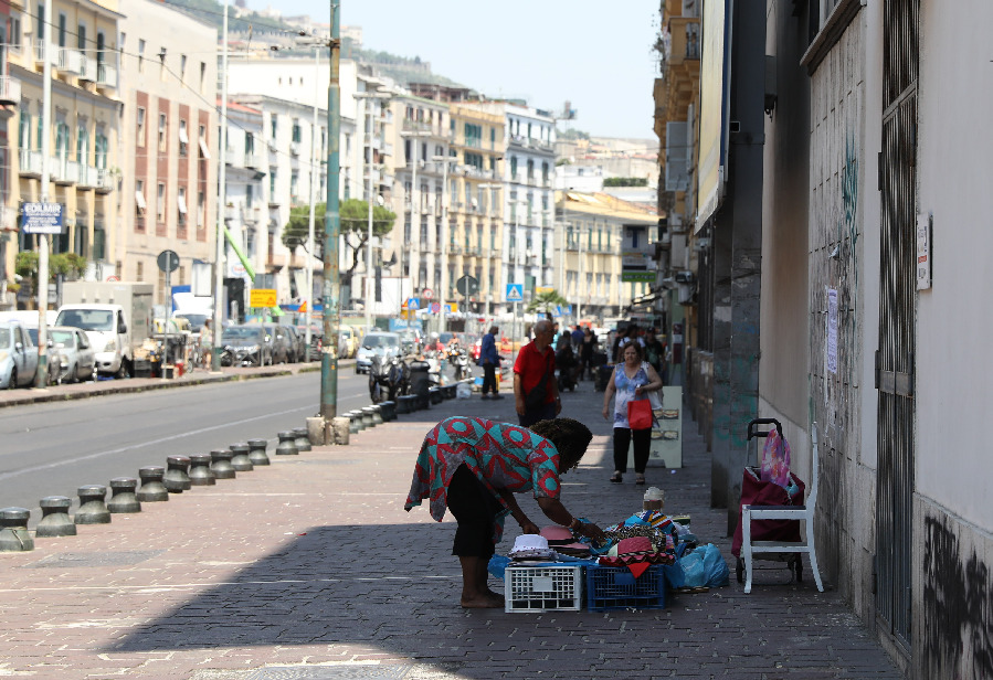 A vendor sells hats on a street in Naples, Italy, July 4, 2019. Sixteen Italian cities, including Naples, have been on heat alert since June 27. (Xinhua/Cheng Tingting)