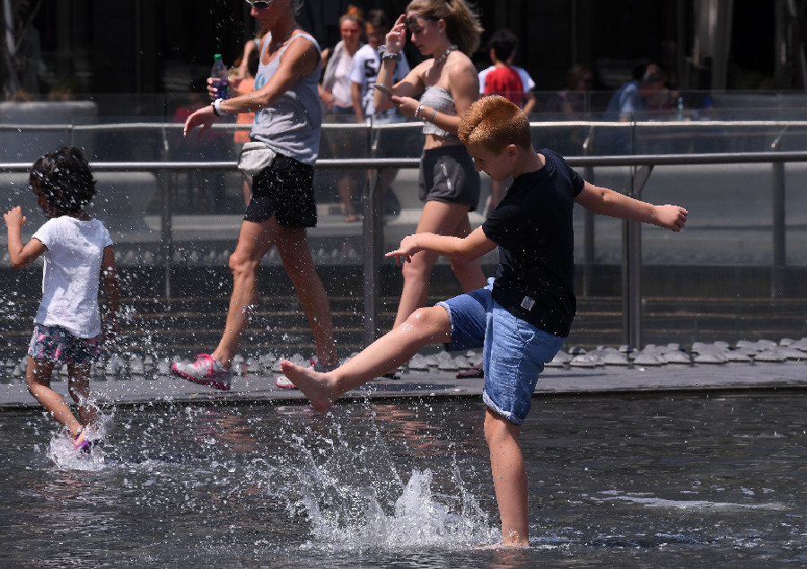 People play in a fountain in Milan, Italy, on June 29, 2019. Sixteen Italian cities are on high alert after two elderly men died from heatstroke in what is being touted as one of the most intense heatwaves to hit Italy in recent years. (Xinhua/Alberto Lingria)