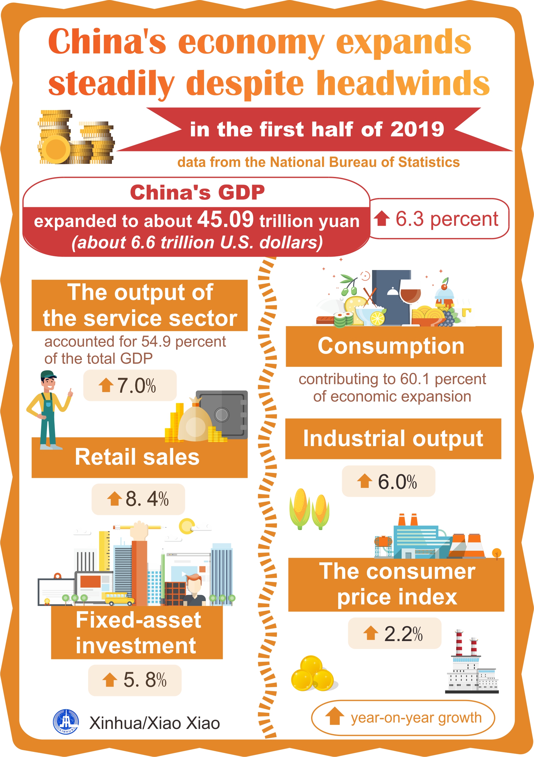 BEIJING, July 15 (Xinhua) -- China's economy expanded steadily in the first half of 2019 as ongoing reform and opening-up helped to offset the impact from complex external and domestic economic situations.