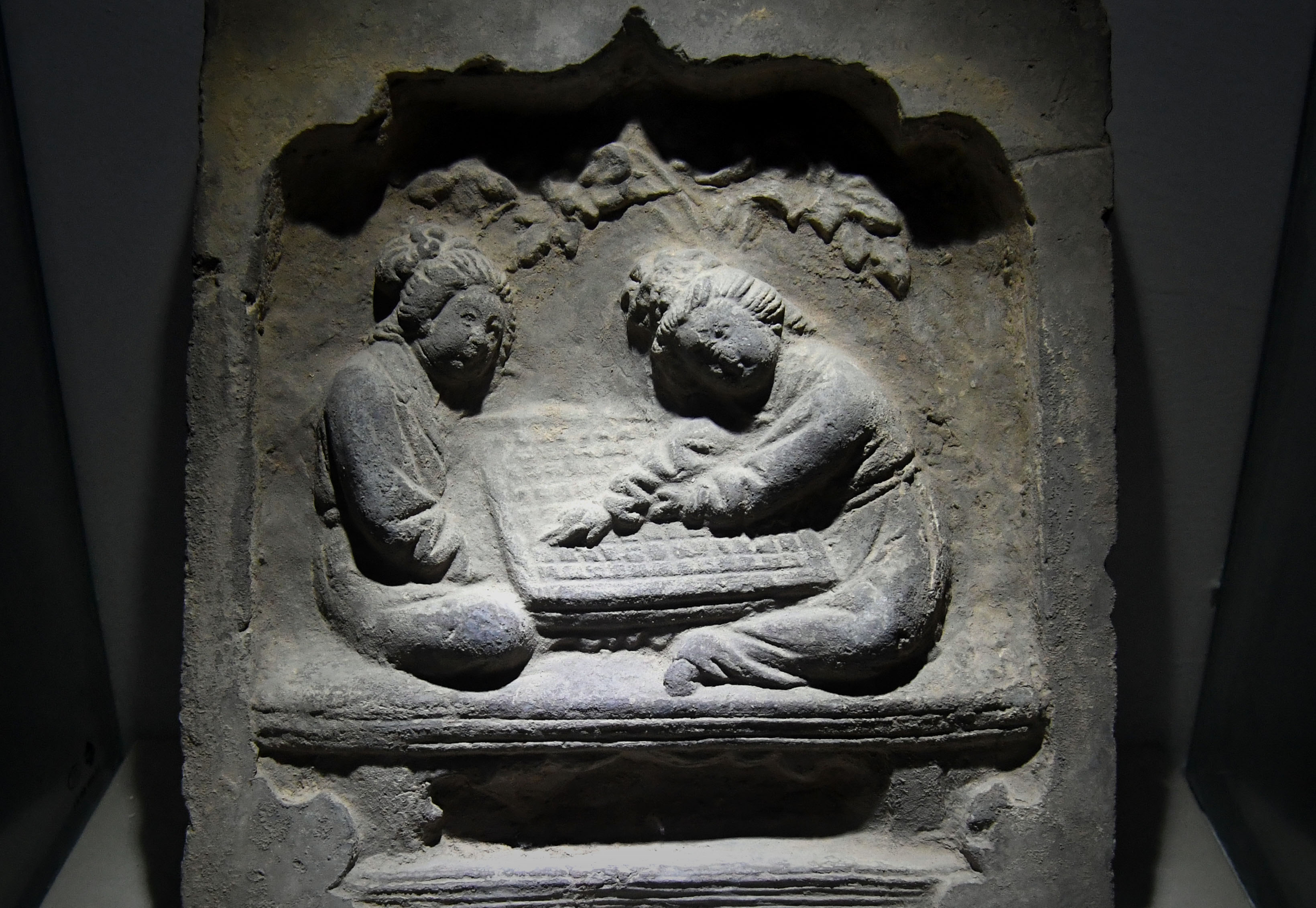 A brick imaging people play Go game is displayed at the Go Museum in Luoyang, central China's Henan Province, May 14, 2019. (Xinhua/Li An)