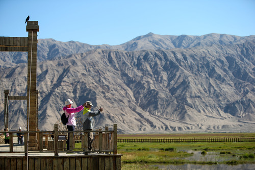 People take photos at a national wetland park in Tajik Autonomous County of Taxkorgan, northwest China's Xinjiang Uygur Autonomous Region, July 9, 2019.(Xinhua)