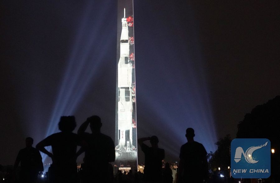 An image of a Saturn V rocket, which was used during Apollo 11 moon landing mission, is projected on the Washington Monument in Washington D.C., the United States, July 16, 2019. The projection is to celebrate the 50th anniversary of the Apollo 11 moon landing. (Xinhua/Liu Jie)