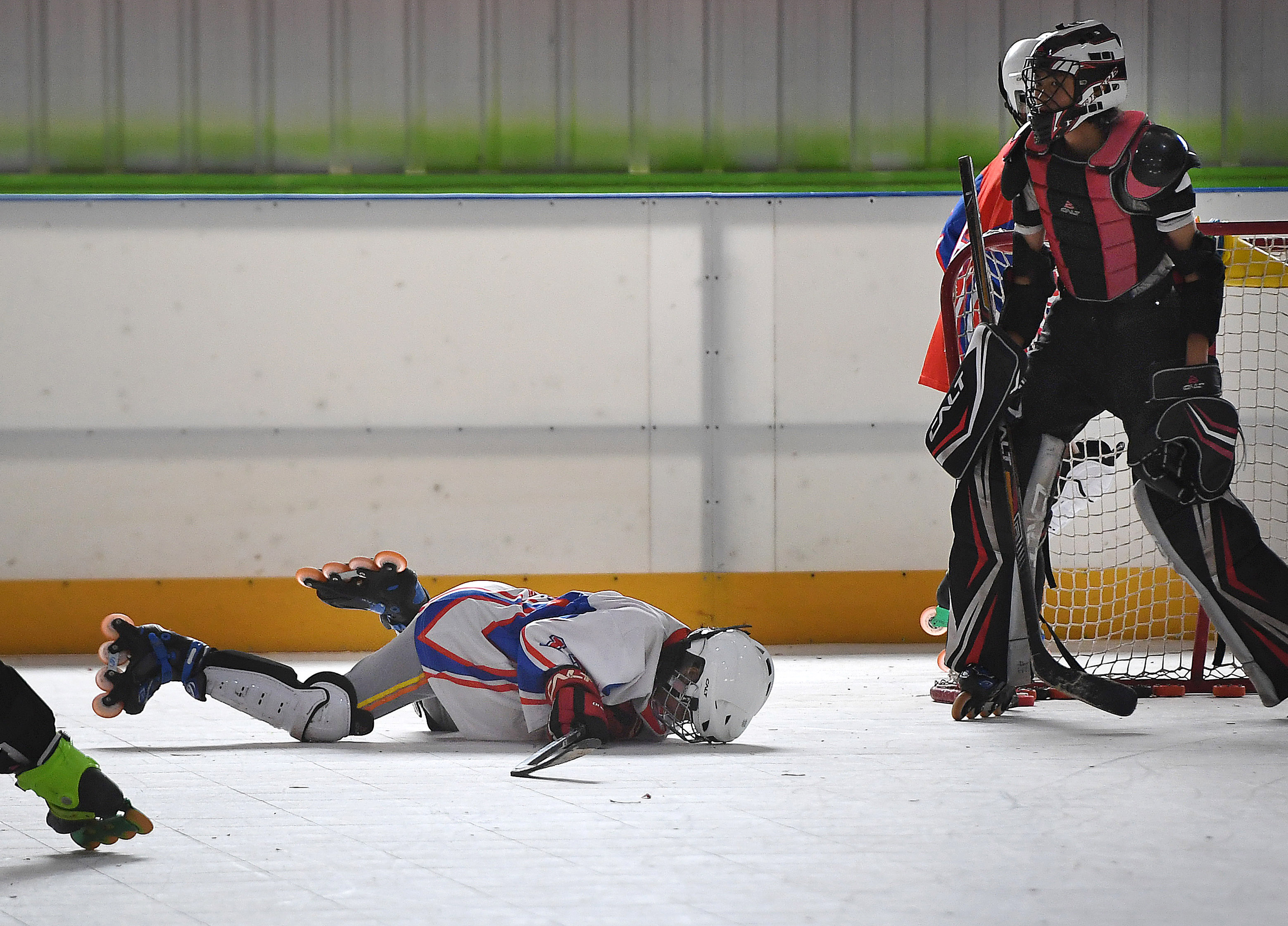 Huang Yuxin (L) of Shicheng Ice Hockey Team helps teammate Li Zhihui get up during adaptive training in Ganzhou City of east China's Jiangxi Province. (Xinhua/Wan Xiang)