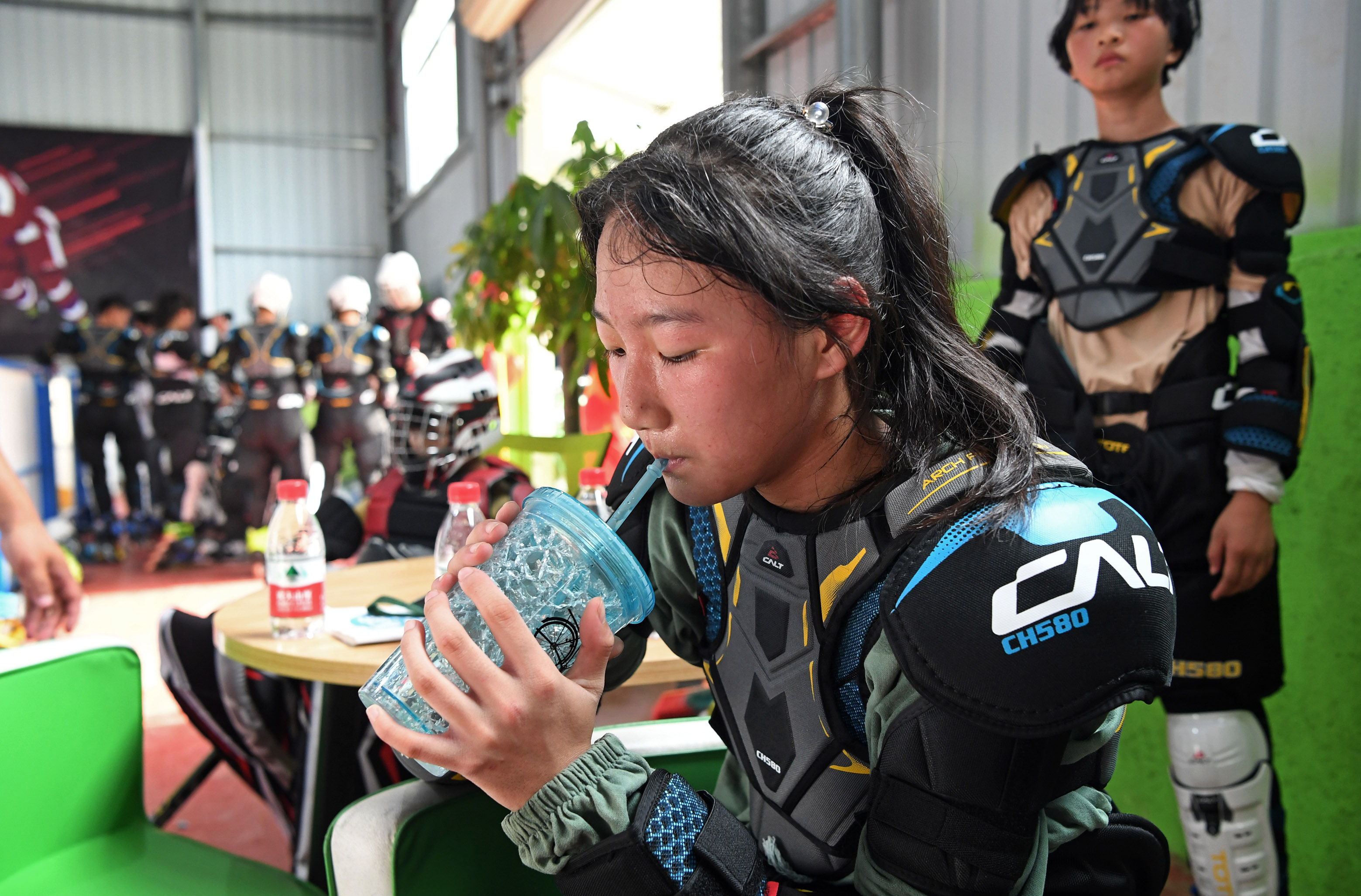 Huang Yuxin (Front) of Shicheng Ice Hockey Team drinks during the break of training in Shicheng, Ganzhou City of east China's Jiangxi Province. (Xinhua/Wan Xiang)