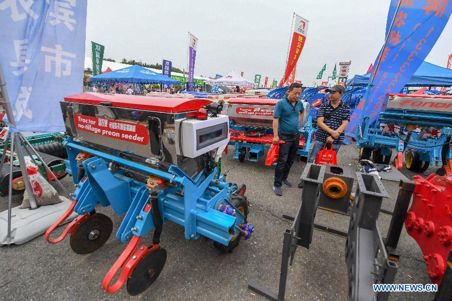 People choose agricultural equipment at the 18th China Changchun International Agriculture and Food Fair Expo in Changchun, northeast China's Jilin Province, Aug. 21, 2019. (Xinhua/Zhang Nan)
