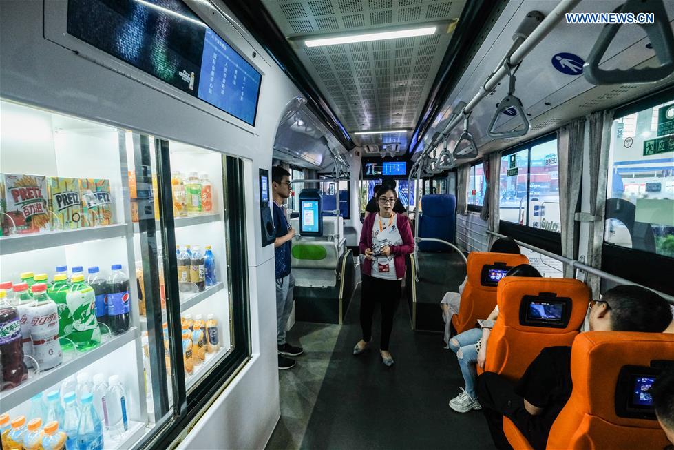 Visitors board an intelligent bus at the 9th China Smart City and Intelligent Economy Expo in Ningbo, east China's Zhejiang Province, Sept. 6, 2019. Unveiled here on Friday, the 9th China Smart City and Intelligent Economy Expo showcases latest products and technologies in the area. (Xinhua/Xu Yu)