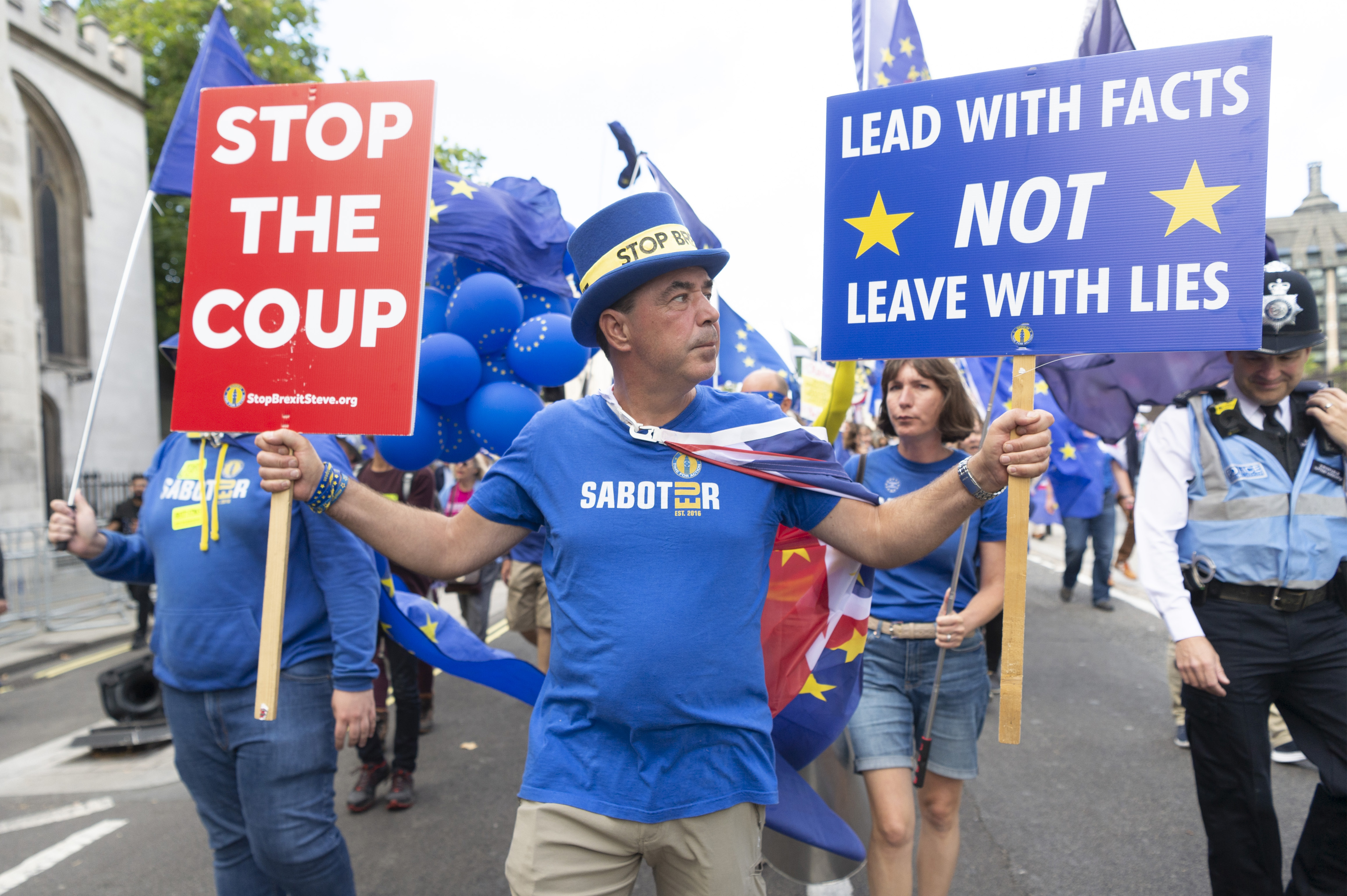 Anti-Brexit protesters take part in a demonstration in London, Britain, on Sept. 3, 2019.(Photo by Ray Tang/Xinhua)