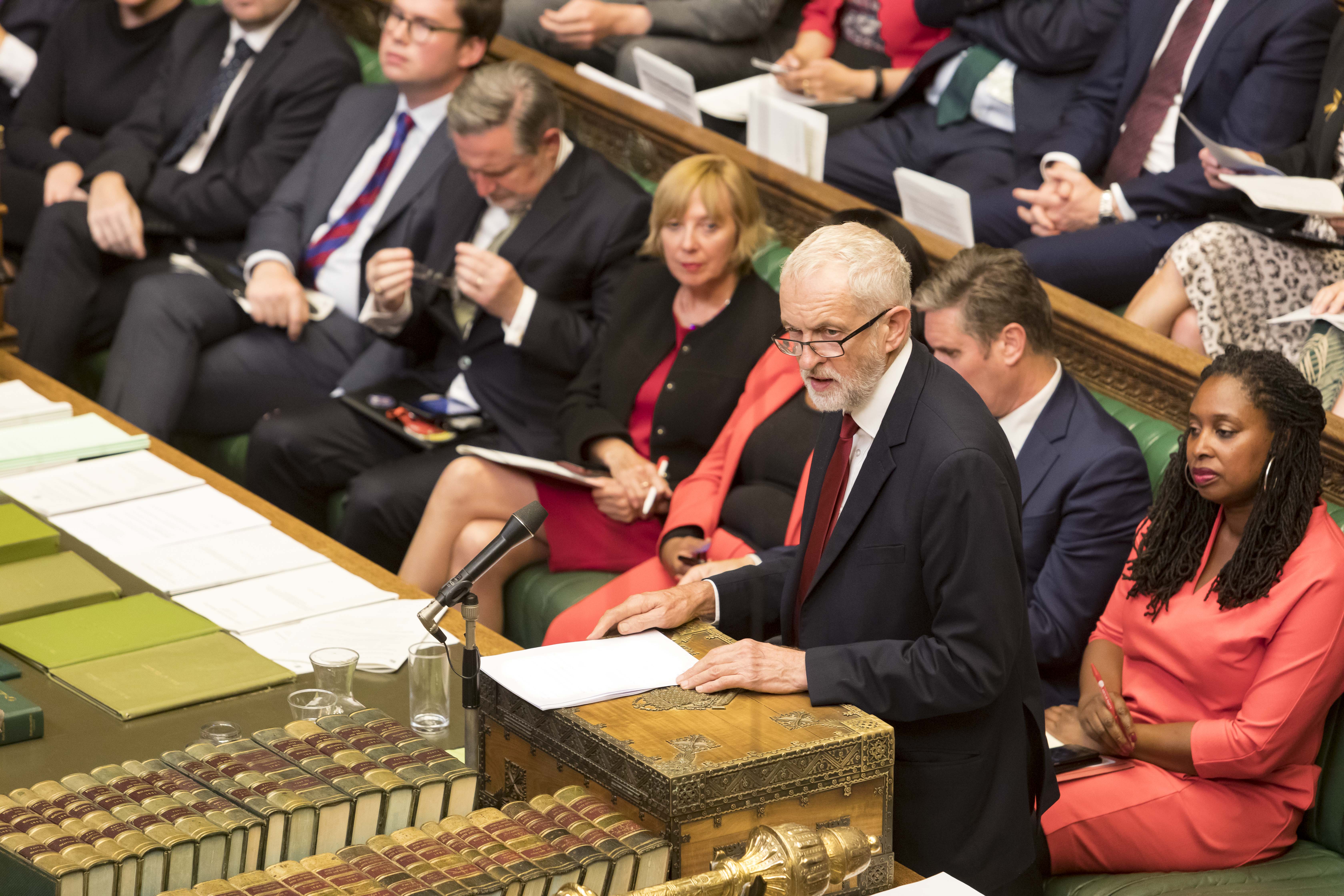 British Labor Party Leader Jeremy Corbyn (Front) speaks in the House of Commons in London, Britain, on Sept. 3, 2019. (Roger Harris/UK Parliament/Handout via Xinhua)