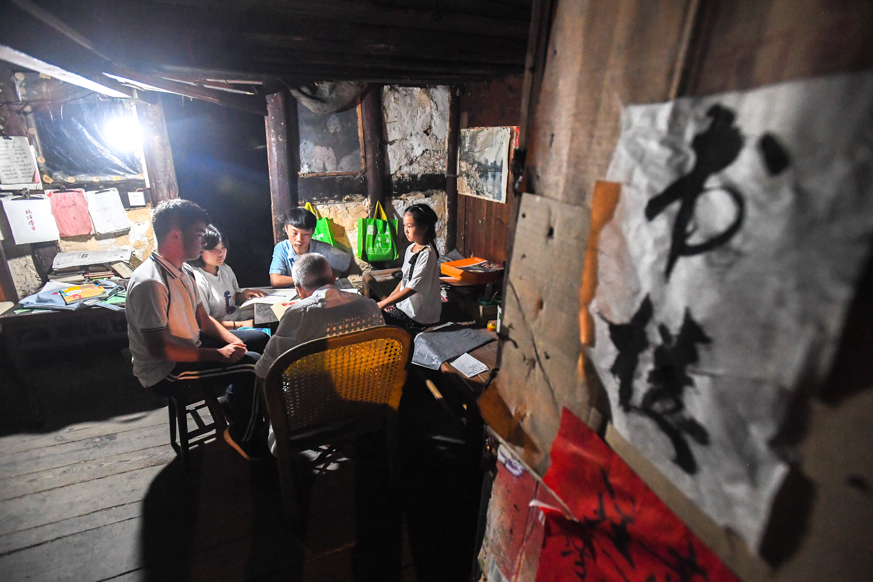 Tang Shangjun tutors students at his home in Wuhan Village of Anhua County in Yiyang City, central China's Hunan Province, Sept. 8, 2019. (Xinhua/Chen Zeguo)