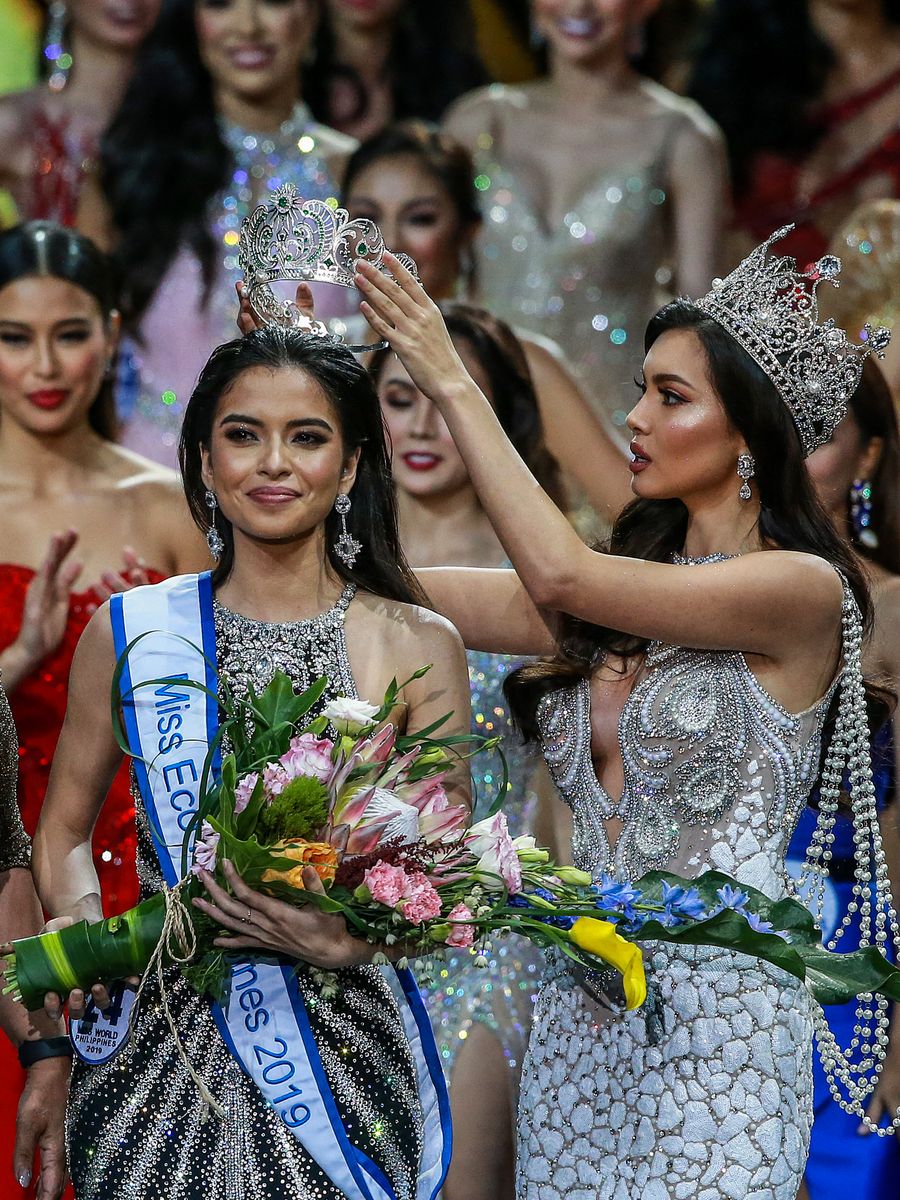 Kelley Day (L) is crowned as Miss Eco Philippines 2019 during the coronation night of Miss World Philippines 2019 in Quezon City, the Philippines, Sept. 16, 2019. (Xinhua/Rouelle Umali)