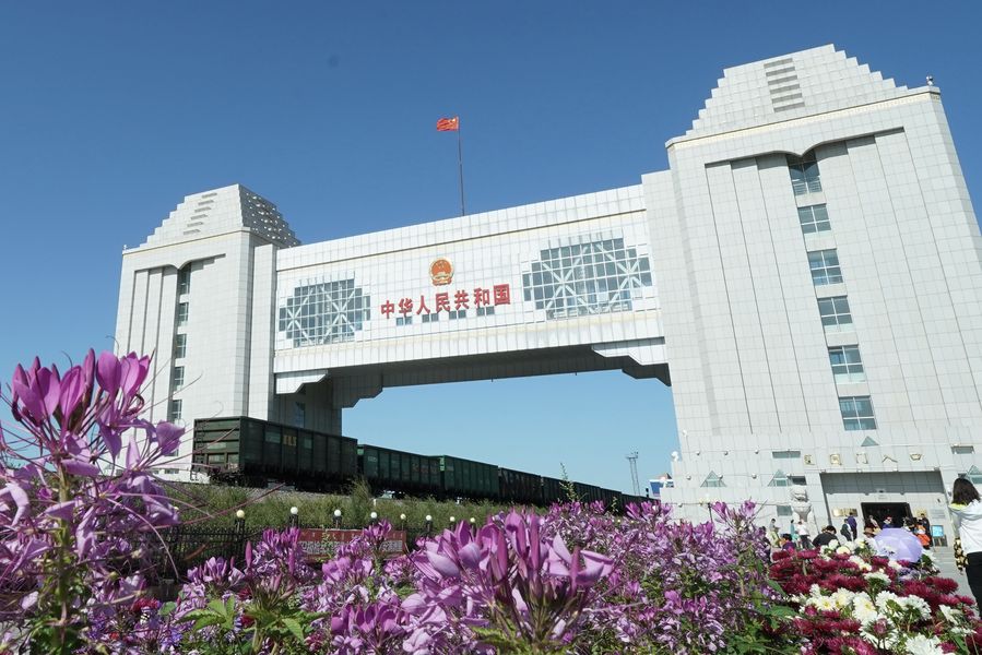 A freight train crosses the China-Russia borderline through the National Gate in Manzhouli, north China's Inner Mongolia Autonomous Region, Aug. 29, 2019. (Xinhua/Chen Jianli)