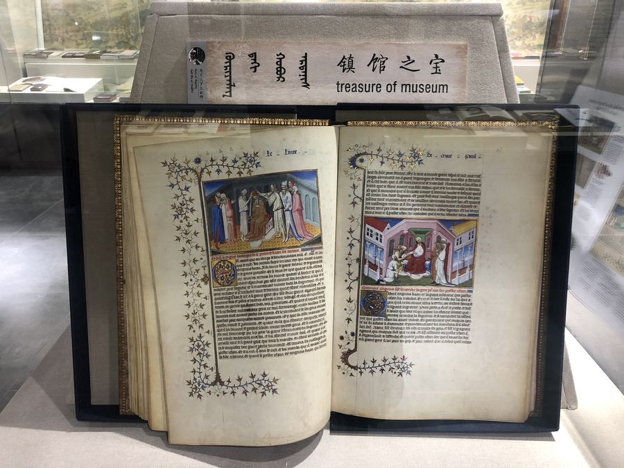A copy of the 1515 French edition of the Travels of Marco Polo is exhibited in the literature library themed Marco Polo, northern China's Inner Mongolia Autonomous Region, Oct. 14, 2019. (Xinhua/Wu Rihan)
