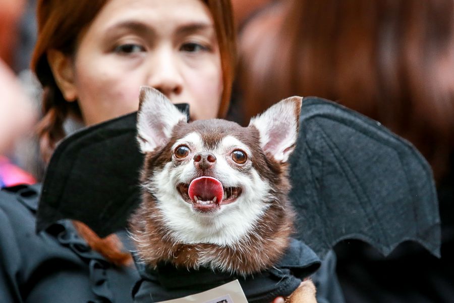 People carry their dogs which are dressed in Halloween costumes as they take part in the "Petrified" Halloween celebration in Quezon City, the Philippines, Oct. 27, 2019. (Xinhua/Rouelle Umali)