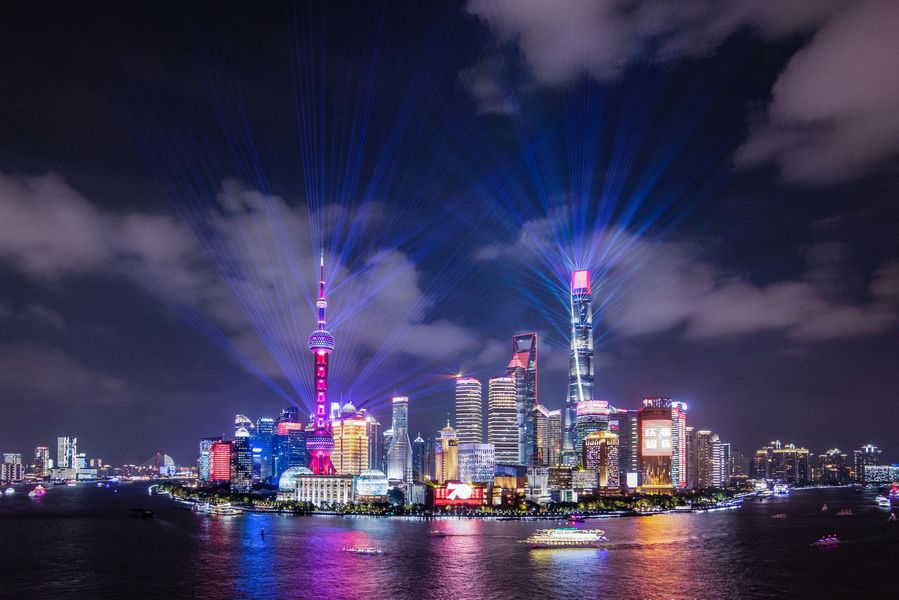 A light show is seen along the Huangpu River in Shanghai, east China, Sept. 18, 2019. (Xinhua/Ren Long)