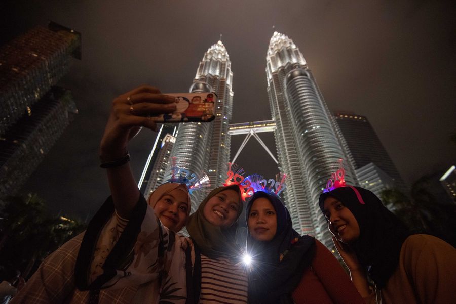 Photo taken on Dec. 31, 2019, shows people celebrate the New Year near the Petronas Twin Towers in Kuala Lumpur, Malaysia. (Xinhua/Chong Voon Chung) ■