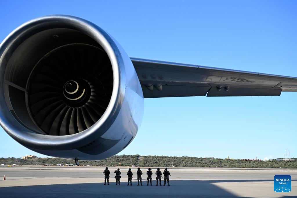Soldiers stand guard beside a migrant repatriation flight at Maiquetia International Airport near Caracas, Venezuela, Dec. 3, 2025. Venezuela has approved a U.S. request to resume migrant repatriation flights, the country's transport ministry said on Tuesday.