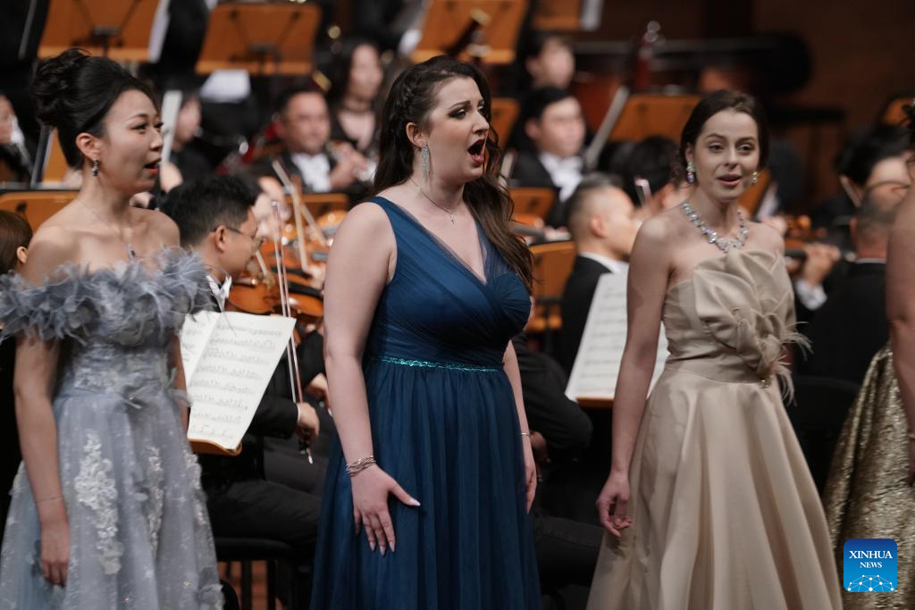 Italian mezzo-soprano Erica Cortese (C) sings during the concert in Guiyang, southwest China's Guizhou Province, Dec. 5, 2025. (Guiyang Symphony Orchestra/Handout via Xinhua)