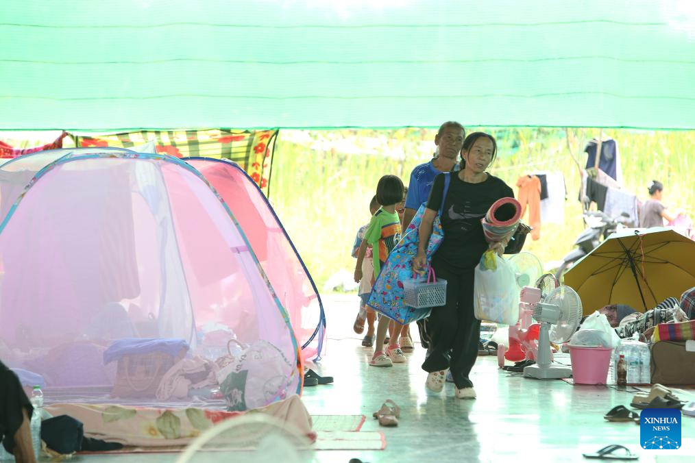 People gather in an evacuation center in Sa Kaew province, Thailand on Dec. 10, 2025. According to Thai media, fresh border clashes between Thailand and Cambodia have forced over 800 schools and many hospitals to temporarily close in Thailand's border provinces.