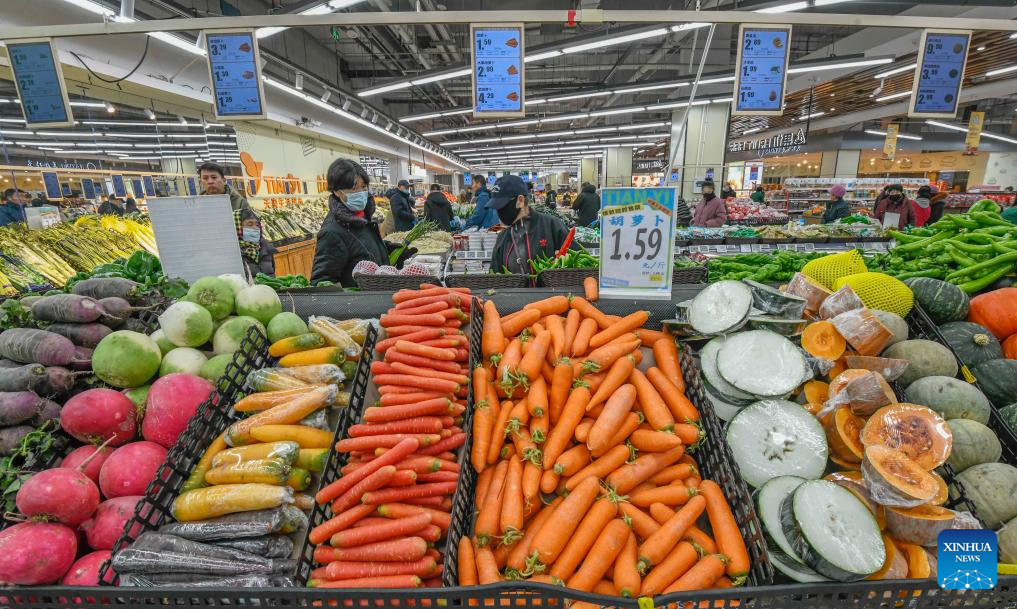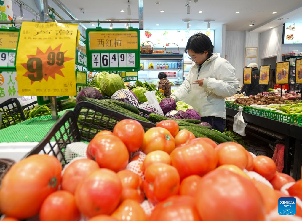 Consumers select vegetable at a supermarket in Tangshan City, north China's Hebei Province, Dec. 10, 2025. China's consumer price index (CPI), a main gauge of inflation, rose 0.7 percent year on year in November, data from the National Bureau of Statistics showed Wednesday. (Photo by Liu Mancang/Xinhua)
