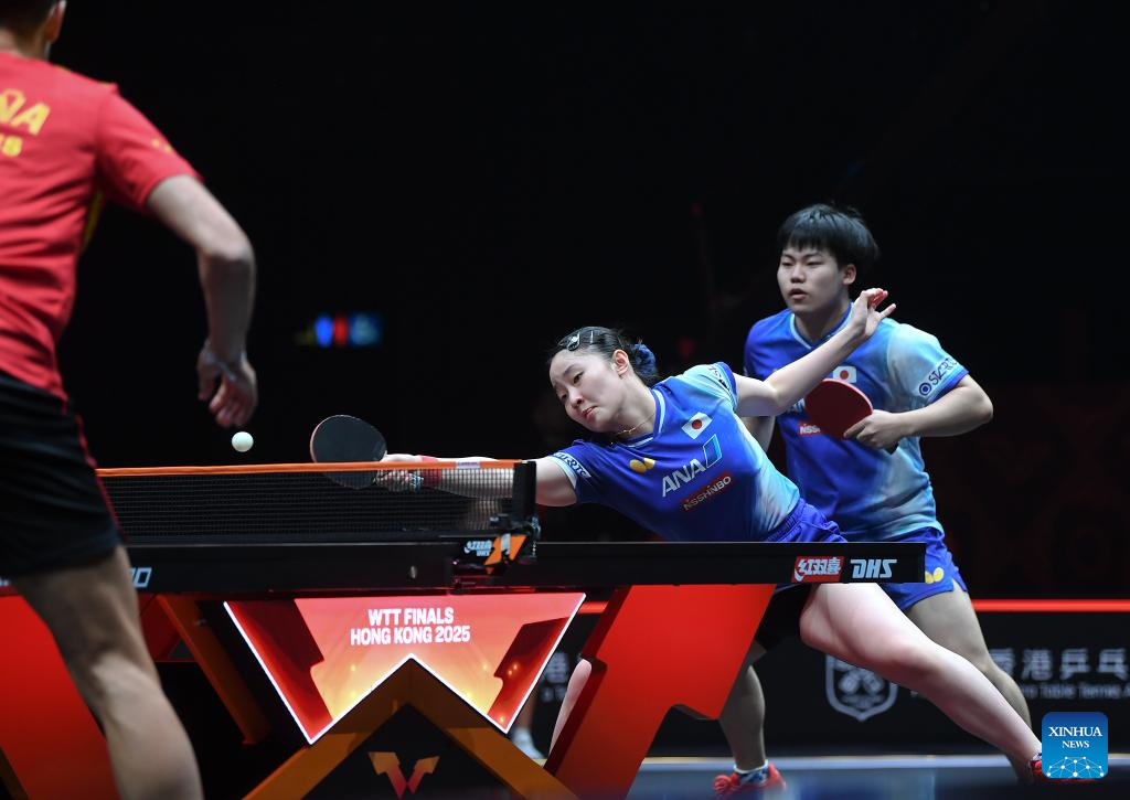 Matsushima Sora (L)/Harimoto Miwa of Japan compete during the mixed doubles group 2 match between Alvaro Robles/Maria Xiao of Spain and Matsushima Sora/Harimoto Miwa of Japan of the WTT Finals Hong Kong 2025 in Hong Kong, south China, Dec. 10, 2025. (Xinhua/Chen Duo)