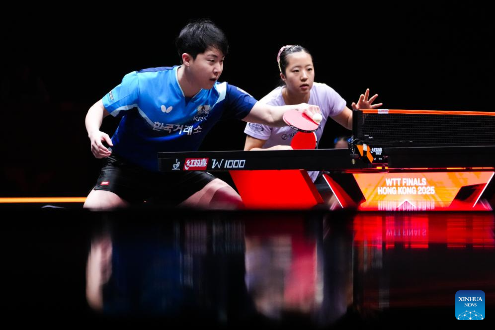Lim Jonghoon (L)/Shin Yubin of South Korea compete during the mixed doubles group 2 match between Lim Jonghoon/Shin Yubin of South Korea and Hugo Calderano/Bruna Takahashi of Brazil of the WTT Finals Hong Kong 2025 in Hong Kong, south China, Dec. 10, 2025. (Xinhua/Zhu Wei)