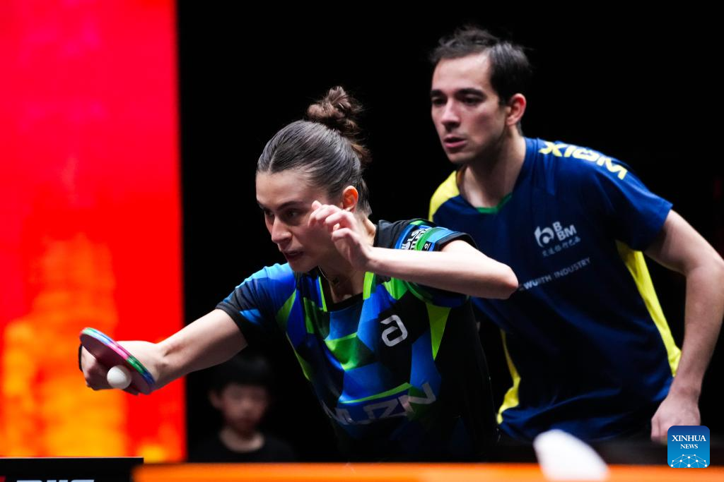 Hugo Calderano (R)/Bruna Takahashi of Brazil compete during the mixed doubles group 2 match between Lim Jonghoon/Shin Yubin of South Korea and Hugo Calderano/Bruna Takahashi of Brazil of the WTT Finals Hong Kong 2025 in Hong Kong, south China, Dec. 10, 2025. (Xinhua/Zhu Wei)