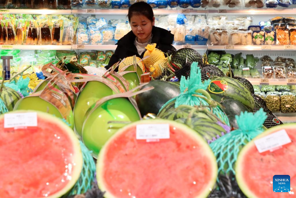 A customer selects fruits at a supermarket in Boxing County, Binzhou City, east China's Shandong Province, Dec. 10, 2025. China's consumer price index (CPI), a main gauge of inflation, grew at a faster pace in November, driven by rising food prices, official data showed Wednesday.