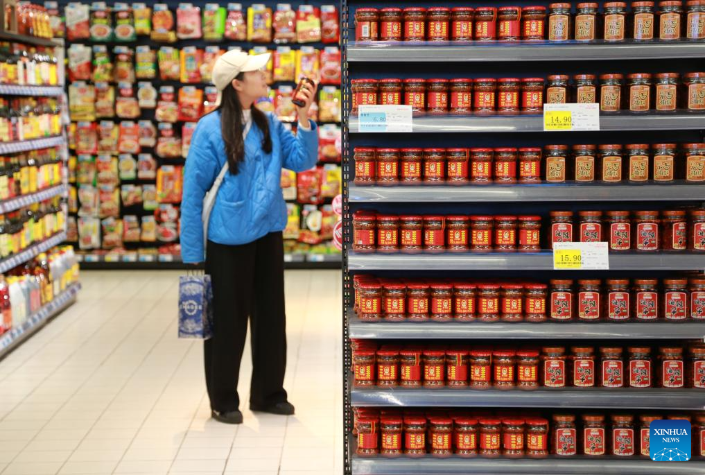 A customer selects products at a supermarket in Mengzi of Honghe Hani and Yi Autonomous Prefecture, southwest China's Yunnan Province, Dec. 10, 2025. China's consumer price index (CPI), a main gauge of inflation, grew at a faster pace in November, driven by rising food prices, official data showed Wednesday.