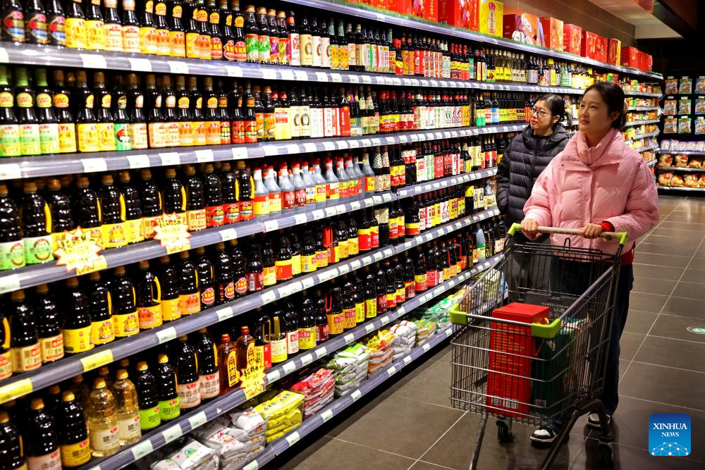 Customers select products at a supermarket in Zaozhuang City, east China's Shandong Province, Dec. 10, 2025. China's consumer price index (CPI), a main gauge of inflation, grew at a faster pace in November, driven by rising food prices, official data showed Wednesday. The CPI rose 0.7 percent year on year in November, accelerating from October's rise of 0.2 percent and marking the fastest pace of growth since March 2024, according to the National Bureau of Statistics (NBS). (Photo by Sun Zhongzhe/Xinhua)