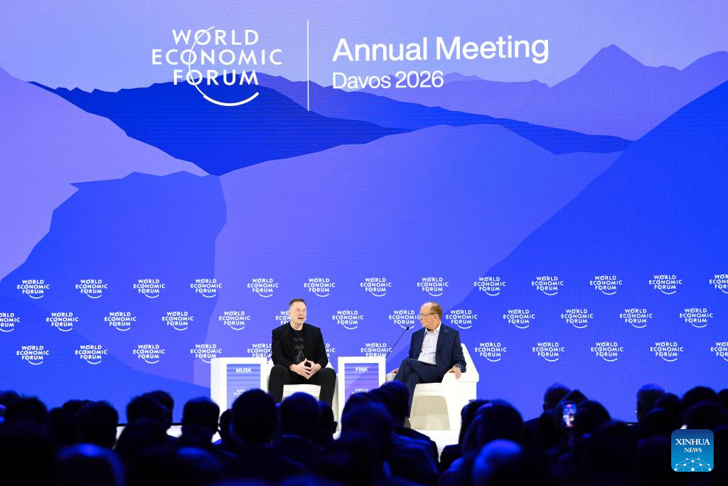 U.S. entrepreneur Elon Musk (L) speaks at the World Economic Forum (WEF) Annual Meeting 2026 in Davos, Switzerland, Jan. 22, 2026. (Xinhua/Lian Yi)