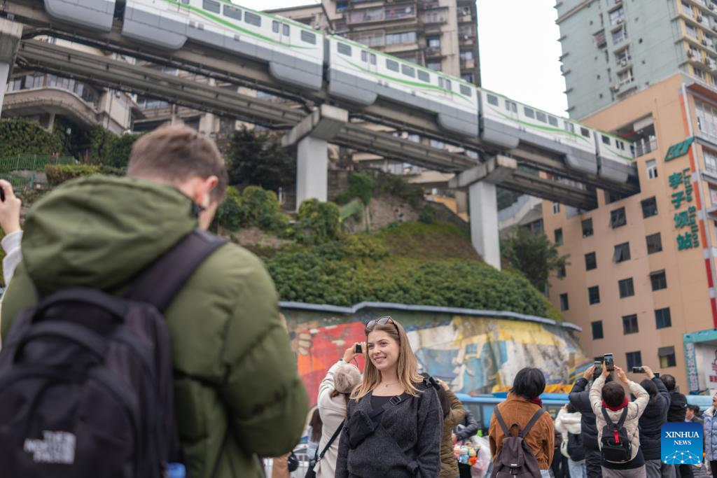 Foreign tourists take photos at a sightseeing platform of Liziba in Yuzhong District of southwest China's Chongqing, Jan. 7, 2026. (Xinhua/Huang Wei)