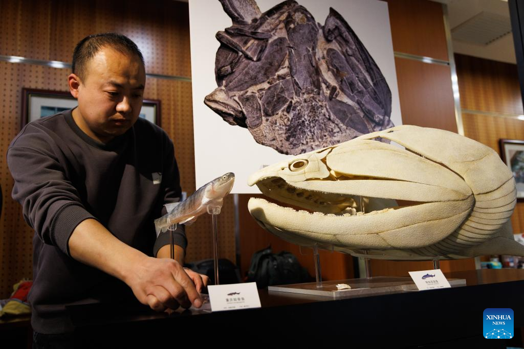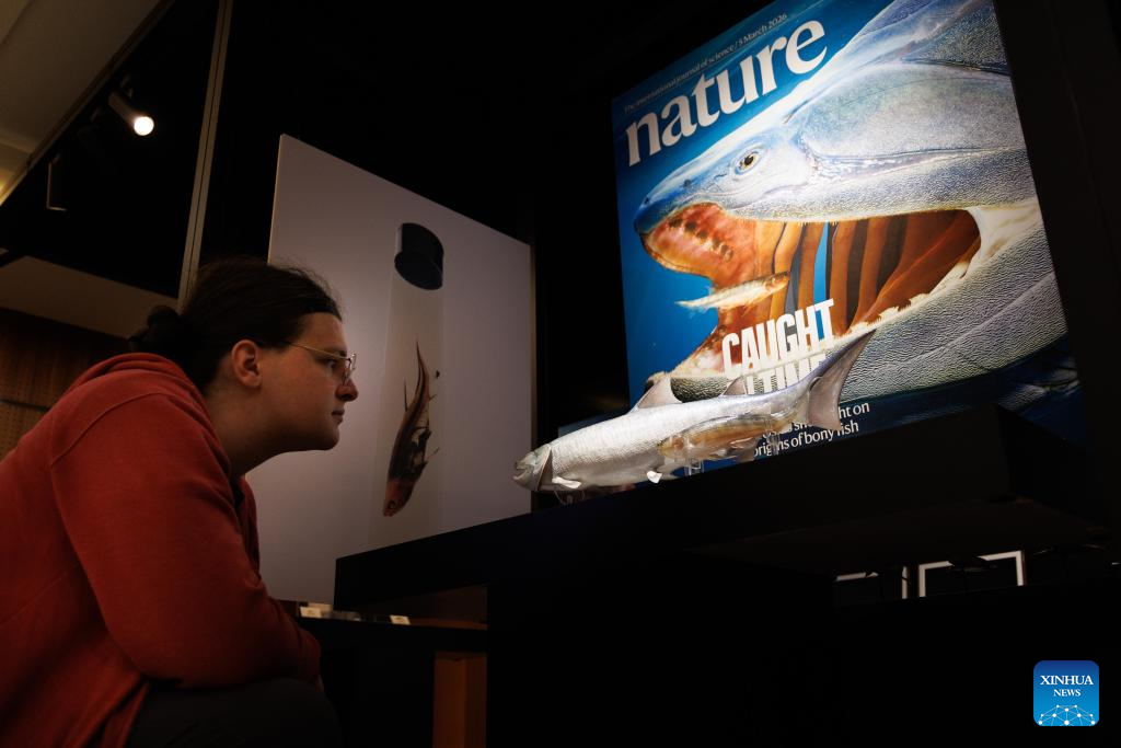 A foreign student views the models of restored ancient fish at the Institute of Vertebrate Paleontology and Paleoanthropology (IVPP) of the Chinese Academy of Sciences (CAS), in Beijing, capital of China, March 3, 2026. Fossils of two fish from over 400 million years ago -- one a tiny streamlined creature, the other a giant among vertebrates of its time with bizarre teeth -- have been discovered in China, filling a critical gap in the evolutionary journey "from fish to human." (Xinhua/Jin Liwang)