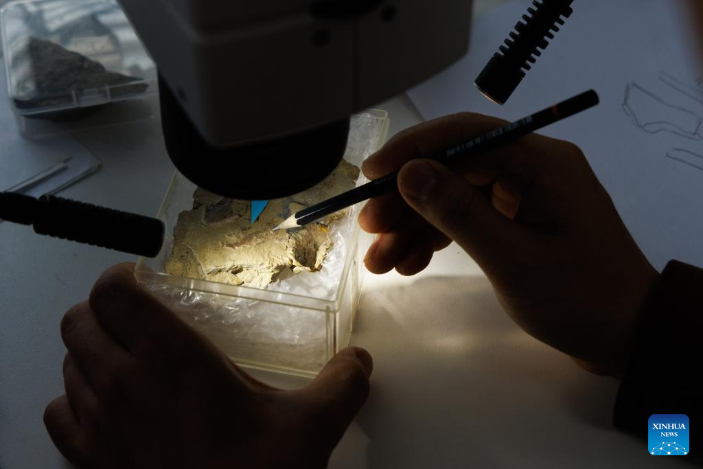 Zhu You'an, a researcher with Institute of Vertebrate Paleontology and Paleoanthropology (IVPP) of the Chinese Academy of Sciences (CAS), studies the fossil of Eosteus chongqingensis at the IVPP, in Beijing, capital of China, March 3, 2026. Fossils of two fish from over 400 million years ago -- one a tiny streamlined creature, the other a giant among vertebrates of its time with bizarre teeth -- have been discovered in China, filling a critical gap in the evolutionary journey "from fish to human." (Xinhua/Jin Liwang)