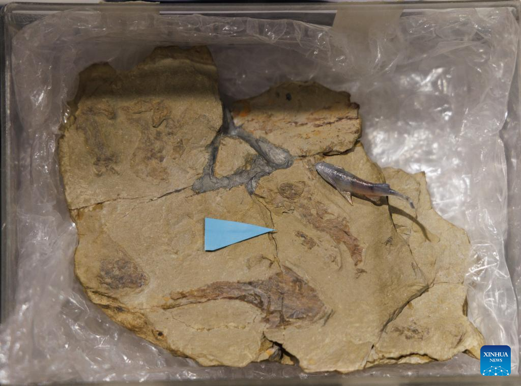 This photo taken on March 3, 2026 shows the fossil of Eosteus chongqingensis at the Institute of Vertebrate Paleontology and Paleoanthropology (IVPP) of the Chinese Academy of Sciences (CAS), in Beijing, capital of China. Fossils of two fish from over 400 million years ago -- one a tiny streamlined creature, the other a giant among vertebrates of its time with bizarre teeth -- have been discovered in China, filling a critical gap in the evolutionary journey "from fish to human." (Xinhua/Jin Liwang)