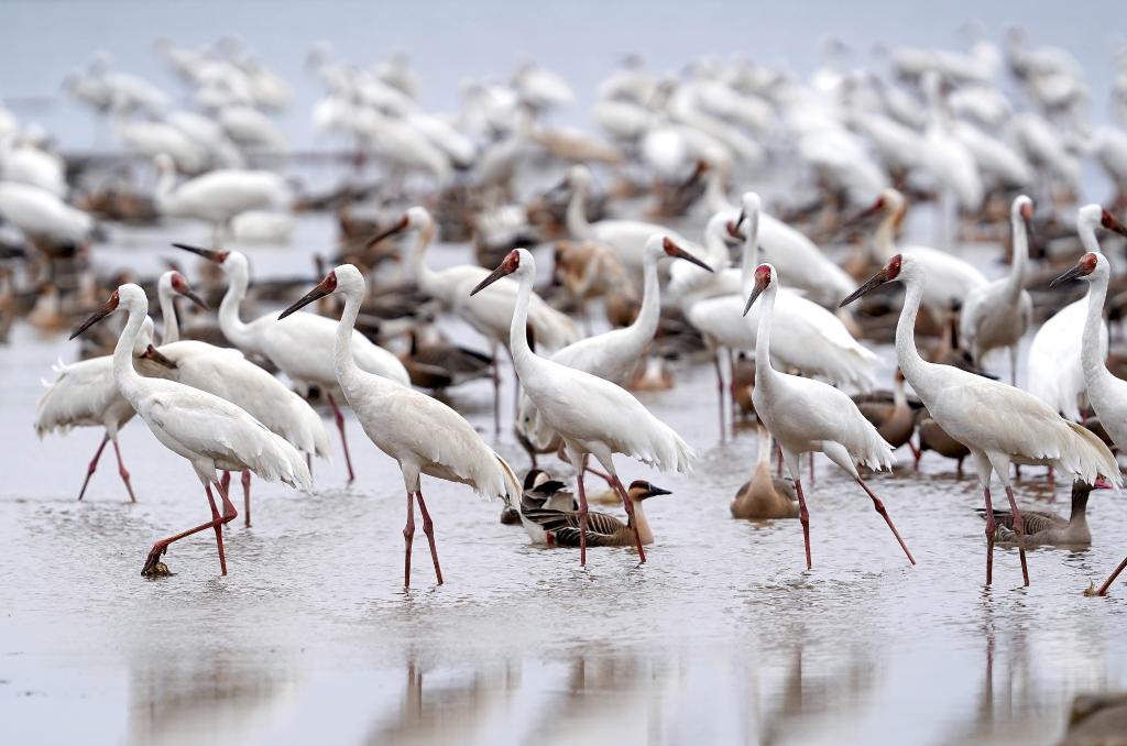 NANCHANG, March 11 (Xinhua) -- Poyang Lake, China's largest freshwater lake, sits in east China's Jiangxi Province. It is a vital wintering and stopover site along the East Asian-Australasian Flyway. Every winter, thousands of Siberian cranes, a critically endangered species, gather in Yugan County, which lies to the southeast of the lake.