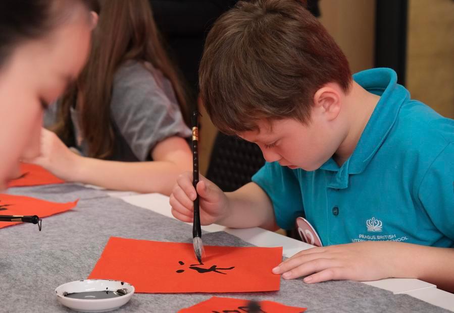 A contestant writes Chinese calligraphy during a Chinese show for primary school students in Prague, the Czech Republic, June 5, 2025. (Xinhua/Deng Yaomin)