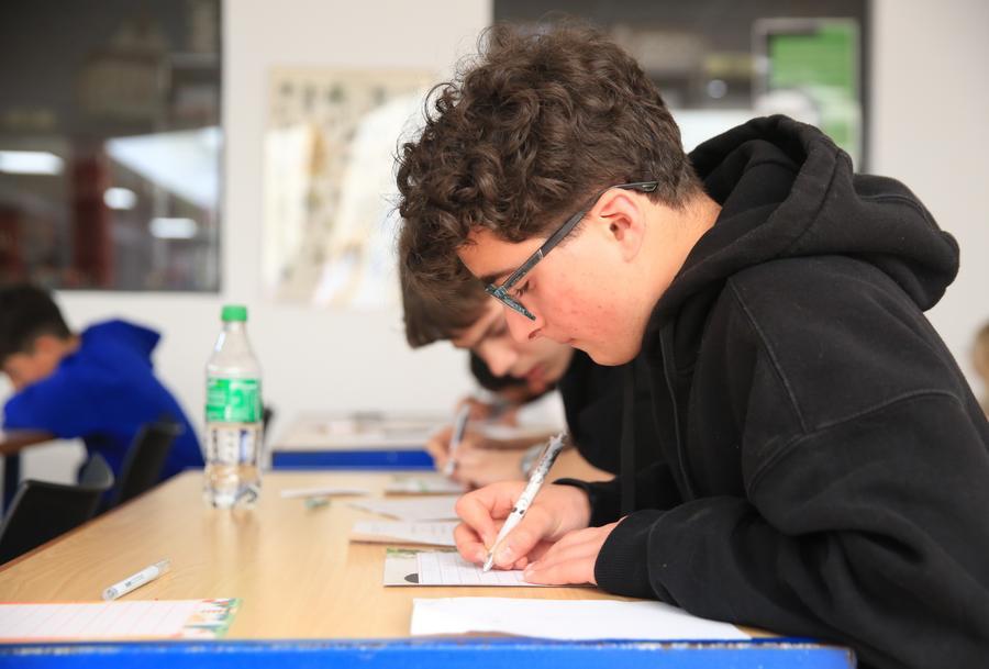Students write Chinese characters during a Chinese character writing competition in Msida, Malta, on April 5, 2025. (Xinhua/Chen Wenxian)