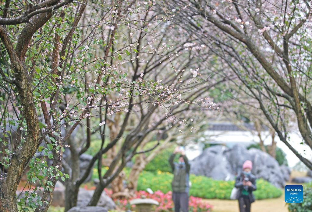 Photo taken on Feb. 13, 2022 shows plum blossoms in Qingxiu Mountain scenic area in Nanning, south China's Guangxi Zhuang Autonomous Region. The Qingxiu Mountain scenic area has attracted many tourists as plum trees are in blossom in early spring. (Xinhua/Zhou Hua)