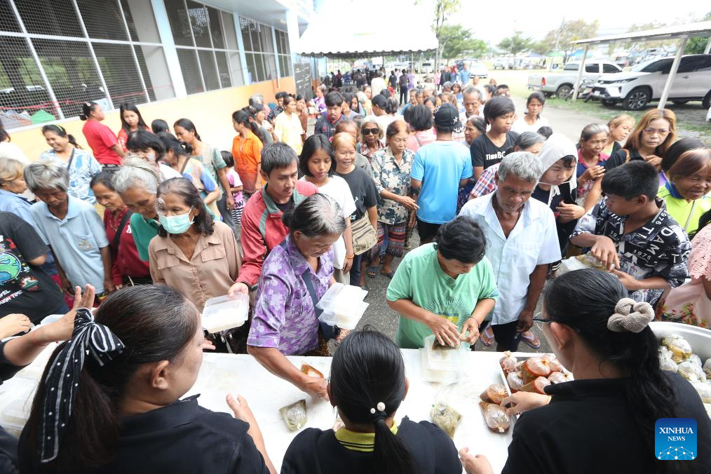 People line up to receive food in an evacuation center in Sa Kaew province, Thailand, on Dec. 10, 2025. According to Thai media, fresh border clashes between Thailand and Cambodia have forced over 800 schools and many hospitals to temporarily close in Thailand's border provinces.