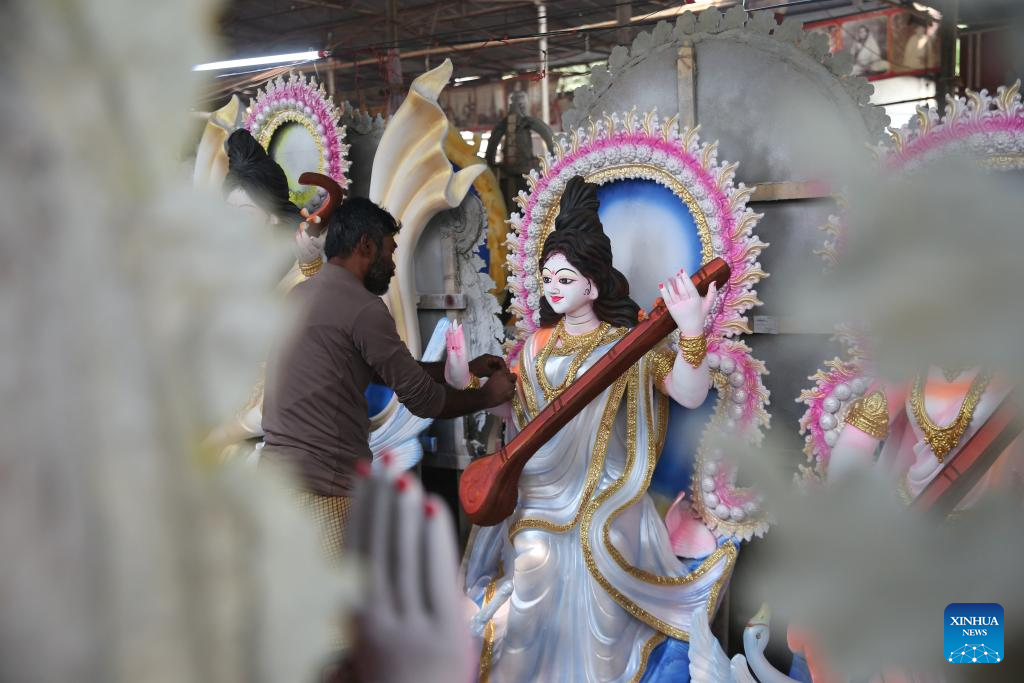 An idol maker paints a clay idol ahead of Saraswati Puja Festival in Dhaka, Bangladesh, on Jan. 20, 2026. (Photo by Habibur Rahman/Xinhua)