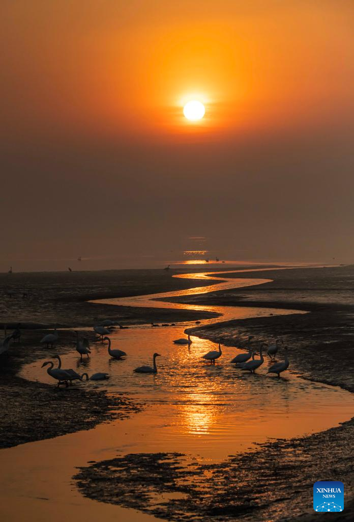 An aerial drone photo taken on Dec. 6, 2025 shows a flock of birds at a wetland park in east China's Jiangsu Province. (Photo by Zhou Shegen/Xinhua)