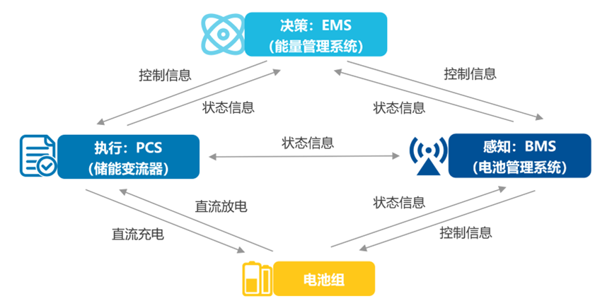 就这样,由EMS负责决策、PCS负责执行、BMS负责感知,与电池组一起,共同完成锂电池储能的日常工作,如下图所示: