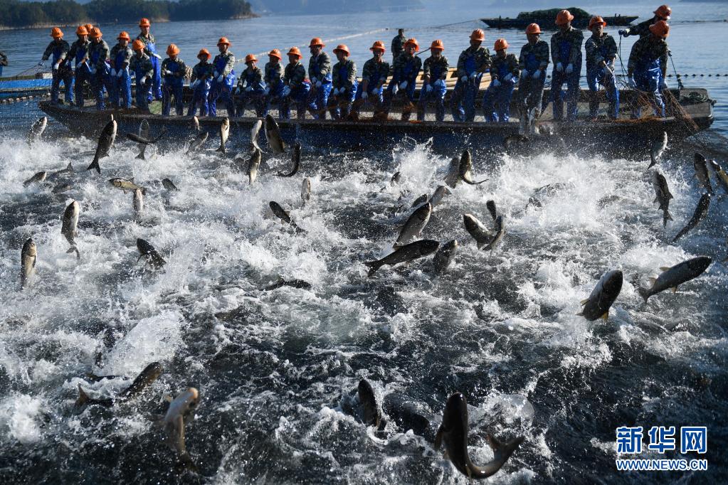 捕撈隊員在千島湖進行巨網(wǎng)捕魚(2018年11月28日攝)。近年來,千島湖以漁業(yè)為基礎(chǔ),建立了集“養(yǎng)殖、管護、捕撈、銷售、加工、烹飪、旅游、文創(chuàng)”為一體的完整產(chǎn)業(yè)鏈,獲得經(jīng)濟效益和生態(tài)效益的雙豐收。