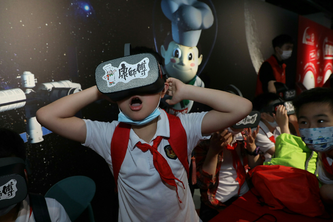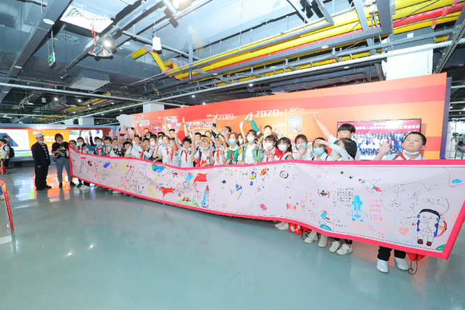 在現(xiàn)場,為了慶祝這場期待已久的航天科普展開幕,孩子們用一份“特別的禮物”——一幅繪滿了航天夢想與武漢名勝的5米長卷獻禮中國航天。在這幅長卷上,孩子們不僅生動地描繪出了武漢的眾多名勝特色,還用天馬行空的想象力展現(xiàn)了自己的航天夢。展區(qū)內(nèi),孩子們在講解員的帶領(lǐng)下參觀形形色色的“國之重器”,了解中國航天發(fā)展史,并且通過VR等設(shè)備親自體驗了一把“太空旅行”。在航天夢想體驗營中,孩子們一起回顧了空間站發(fā)射的精彩瞬間,當看到“長五B”成功升空時,現(xiàn)場爆發(fā)出熱烈的歡呼和掌聲,加油聲此起彼伏,許多孩子還合唱《明天會更好》對中國航天獻上祝福。