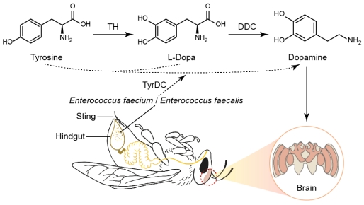该研究通过综合行为学、代谢组学及微生物定植等实验发现,蜜蜂肠道菌群中的肠球菌可通过调节肠道、血淋巴和大脑中的多巴胺水平,影响工蜂在防御行为中的厌恶性学习与记忆,阐明了肠–脑轴在蜜蜂防御行为中的作用机制。该成果为理解蜜蜂社会行为的分子神经机制提供了新的研究视角,也蜜蜂高效健康养殖提供了重要理论依据。中国农业科学院蜜蜂研究所为该研究第一完成单位,该研究得到中国农业科学院科技创新工程的支持。