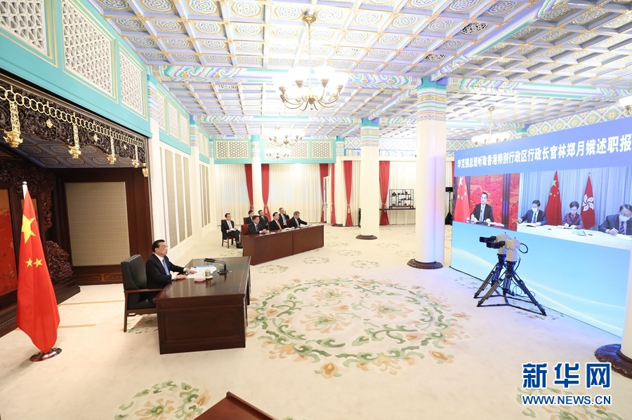 1月27日,國務(wù)院總理李克強(qiáng)在北京中南海紫光閣以視頻連線方式聽取香港特別行政區(qū)行政長(zhǎng)官林鄭月娥2020年度的述職報(bào)告。國務(wù)院副總理韓正出席。新華社記者 王曄 攝