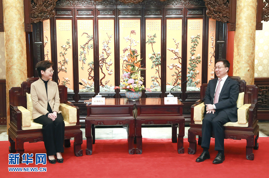 3月6日,中共中央政治局常委、國務(wù)院副總理韓正在北京釣魚臺(tái)國賓館會(huì)見香港特別行政區(qū)行政長官林鄭月娥。新華社記者 龐興雷 攝