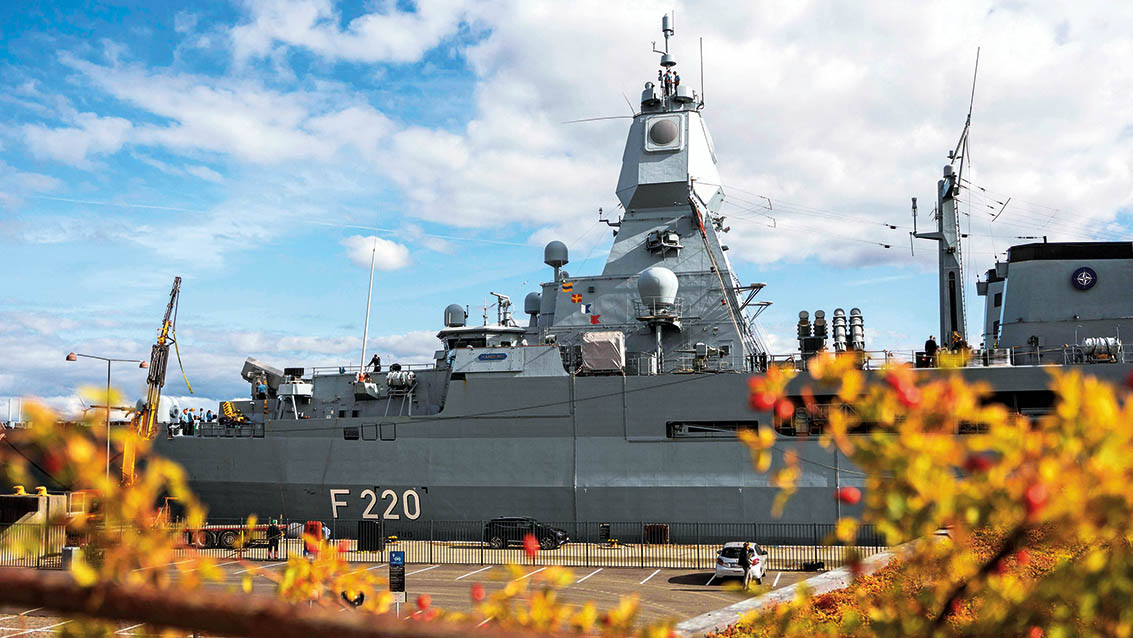 这是 2025 年 9 月 28 日在丹麦哥本哈根拍摄的协助空域监视的德国“汉堡”号护卫舰