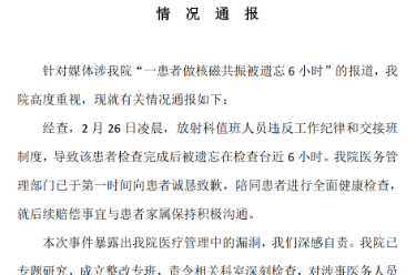 一患者做核磁共振被遺忘近6小時,醫(yī)院通報
